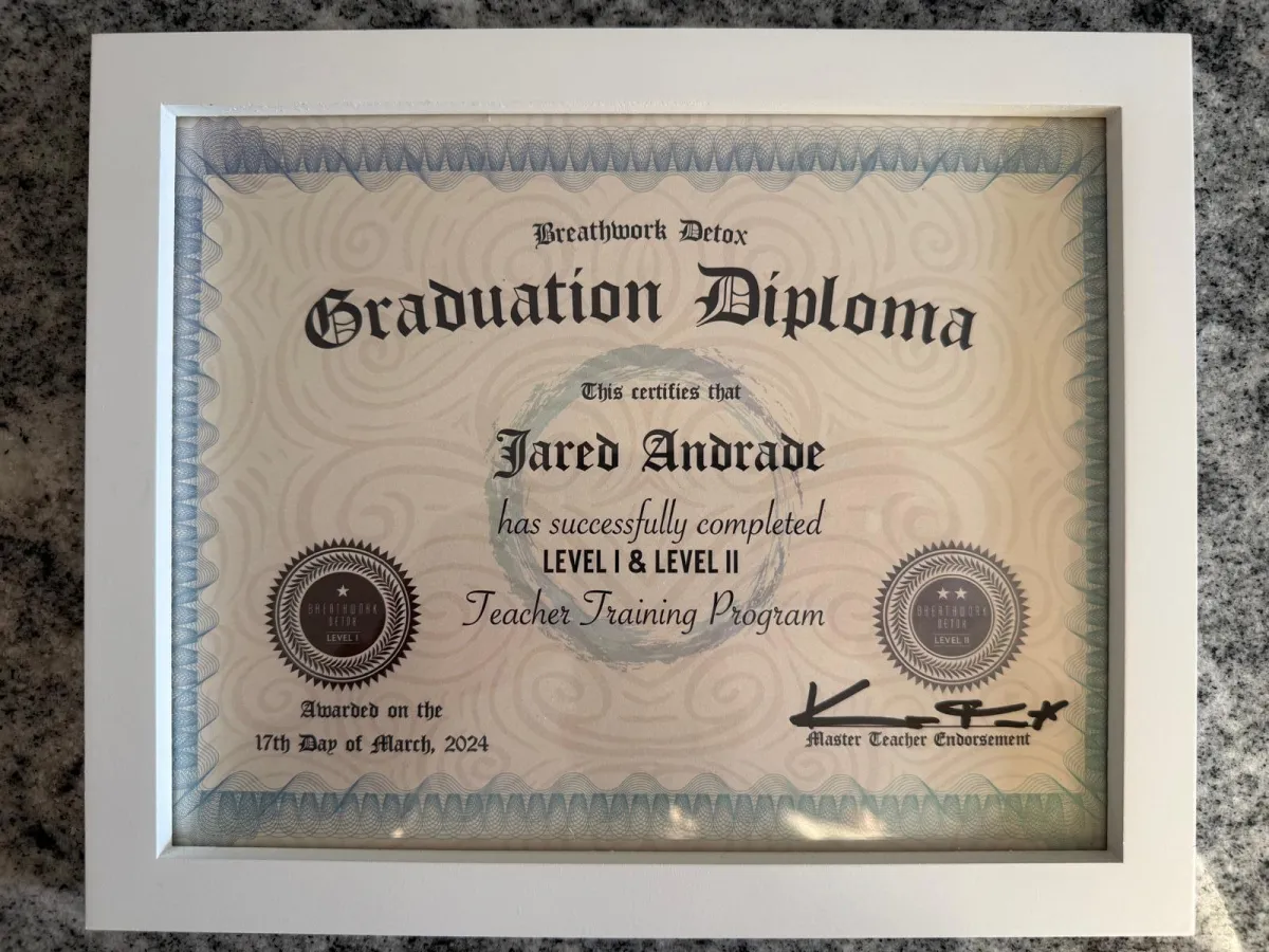 Completed a formal Teacher Training Program, equipping Jared to not only practice but to instruct and certify others in breathwork and nervous system regulation methodology.